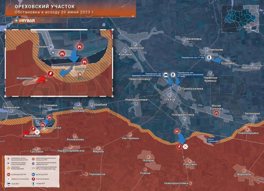 Ореховский участок Обстановка к исходу дня 20 июня 2023 годаСегодня утром бронегруппа 128 огшбр ВСУ вошла в село Пятихатки, которое находилось в серой зоне, а оттуда пехота наскоком попыталась прорваться к Жеребянкам.В результате завязавшегося боя...