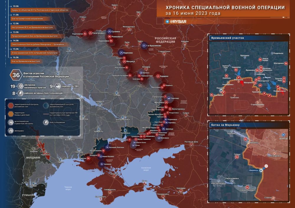 Фронтовая сводка 16 июня. Двенадцатый день контрнаступления ВСУ. Волновахское направление. На Времевском выступе продолжаются бои, линия фронта без изменений. Наши военные противостоят попыткам ВСУ развить наступательный импульс — противник ведет...