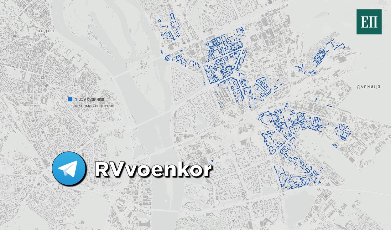 На карте дома в Киеве, которые останутся без тепла до конца зимы. На левобережье столицы Украины без тепла останется половина домов как минимум на 2 месяца из-за разрушения Дарницкой ТЭС во время недавнего удара.