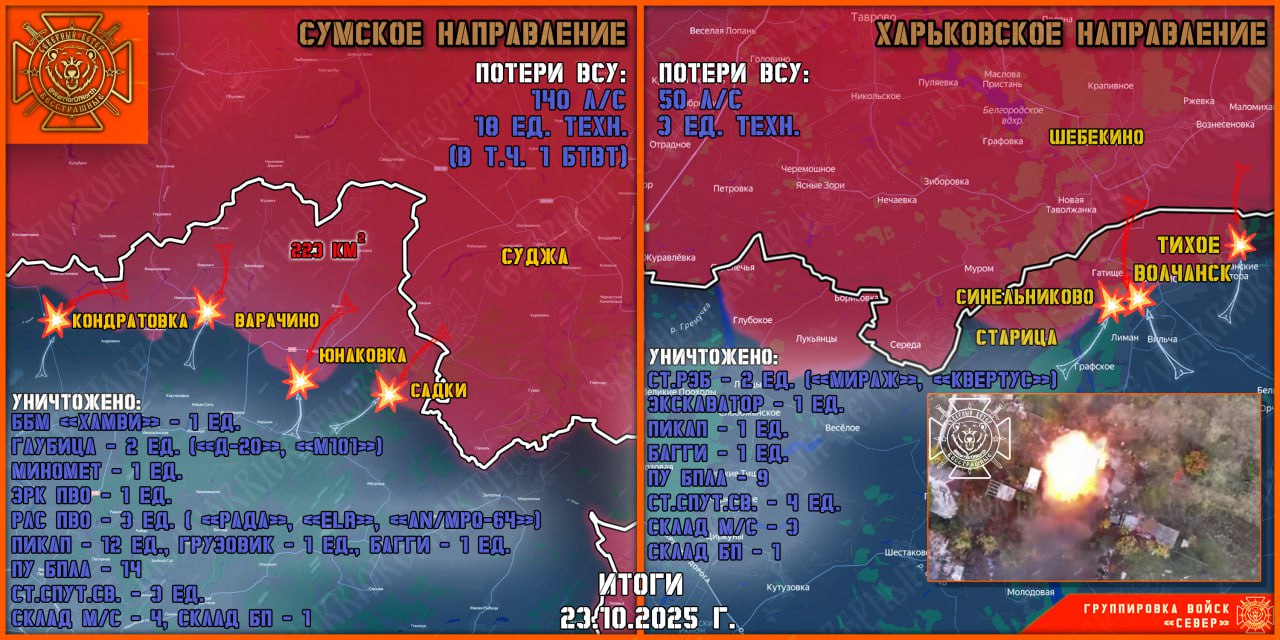 В Волчанске и окрестностях Воины Севера с тяжелыми боями продолжают продвижение при поддержке авиации ВКС РФ, артиллерии и ТОСов. На Хатненском участке фронта также есть успехи. Противник отсиживается в обороне.