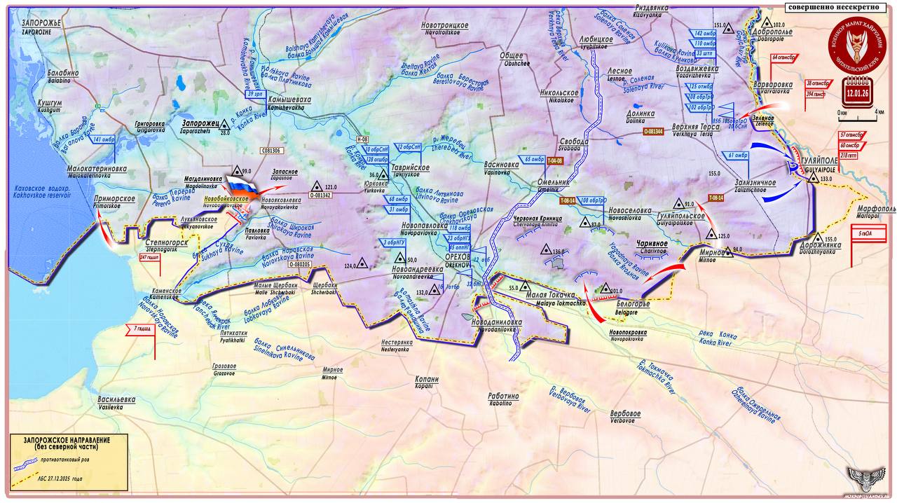 ВС РФ ведут активные действия на обоих флангах Запорожского направления. 11 января был освобожден н.п. Белогорье на правом фланге направления, а 12 января российские подразделения продвинулись от н.п. Лукьяновское на северо-восток и освободили н.п. Новобойковское (47°3754 с. ш. 35°2838 в. д. - население 34 чел. в 2001 г.).