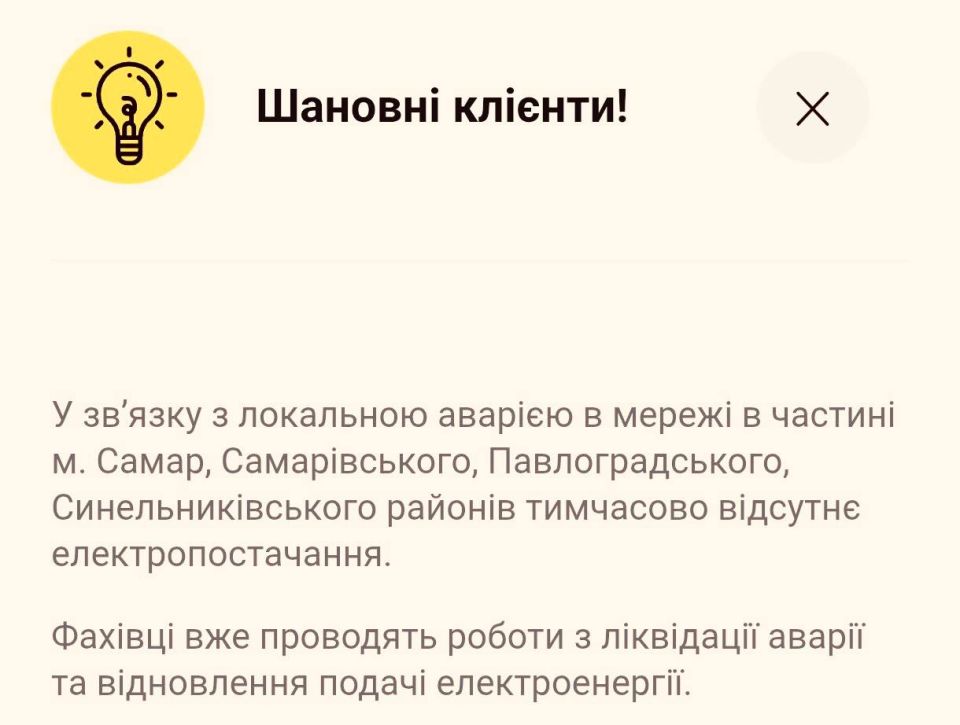 В части города Самар, а также в Самаровском, Павлоградском и Синельниковском районах временно отсутствует электроснабжение из-за аварии в сети, сообщили в ДТЭК.Ранее власти региона подтверждали удары по энергетике.Украина.ру — подписаться и знать...