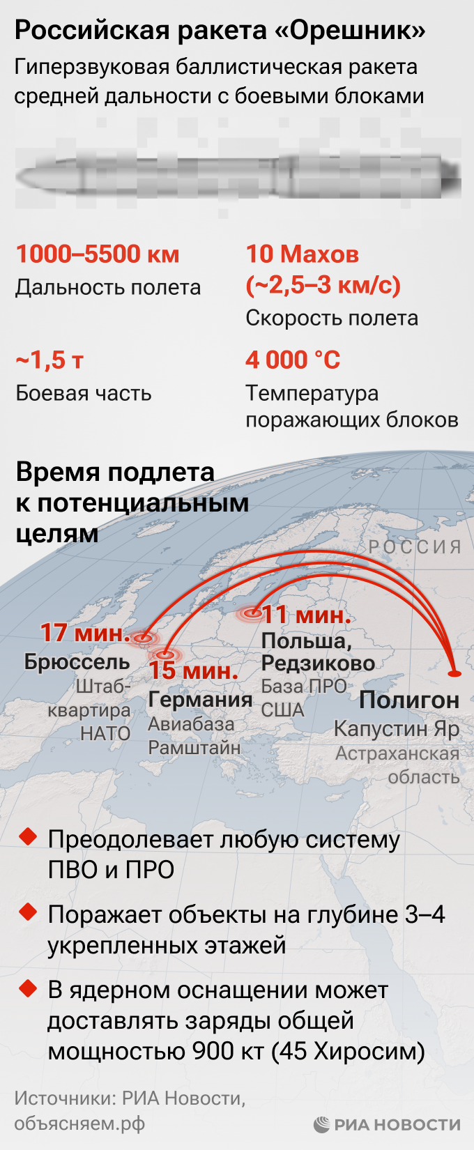 Впервые испытание новейшей российской системы средней дальности было проведено 21 ноября 2024 года. Удар нанесен по одному из ключевых заводов украинского ВПК в Днепропетровске. Это ответ на разрешение западных союзников Украины наносить удары вглубь России дальнобойными снарядами. По словам Владимира Путина, использовали баллистическую ракету средней дальности с боевыми блоками “Орешник”. Дальность полета — до пяти с половиной тысяч километров. Благодаря скоростным характеристикам она способна долететь до ключевых объектов НАТО в Европе за очень короткое время. 17 декабря 2025-го Путин сообщил, что "Орешник" будет поставлен на боевое дежурство в России до конца года. Что известно о ракете “Орешник” и какие объекты попадают в зону поражения, смотрите в инфографике Ria.ru.