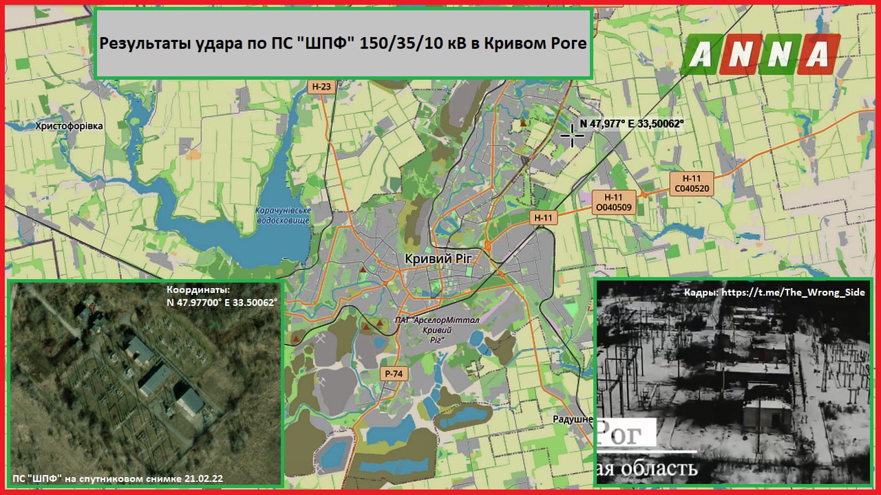 Кадры объективного контроля результатов высокоточного удара по ПС "ШПФ" 150/35/10 кВ (N 47.97700° E 33.50062°) на севере города Кривой Рог в Днепропетровской области показал канал "Изнанка".