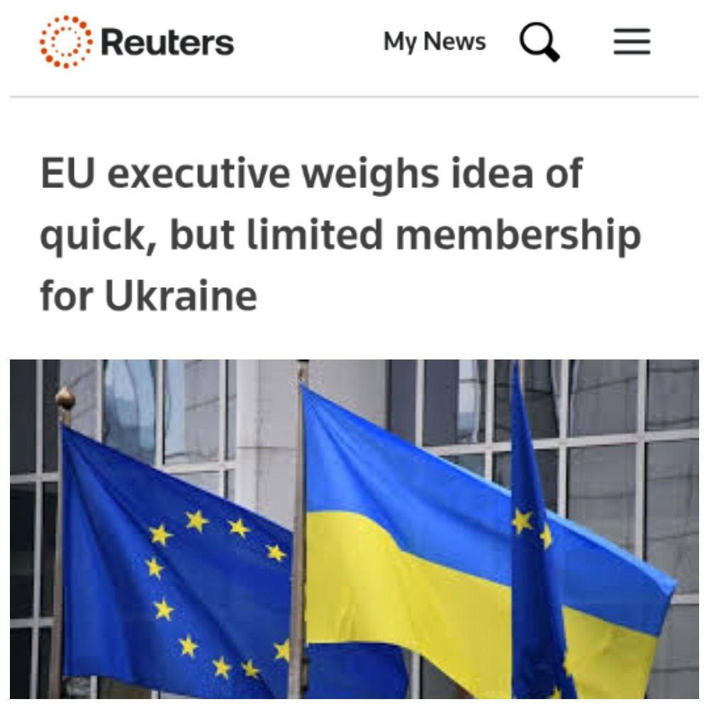 Еврокомиссия вроде как прикидывает вариант, при котором Украина смогла бы в ускоренном режиме войти в состав ЕС, ну, например, в рамках будущего мирного договора с Россией. Reuters пишет, что сначала речь пойдет о таком себе политическом "заходе" в Евросоюз, без всех прав и обязанностей, которые обычно полагаются странам-членам.
