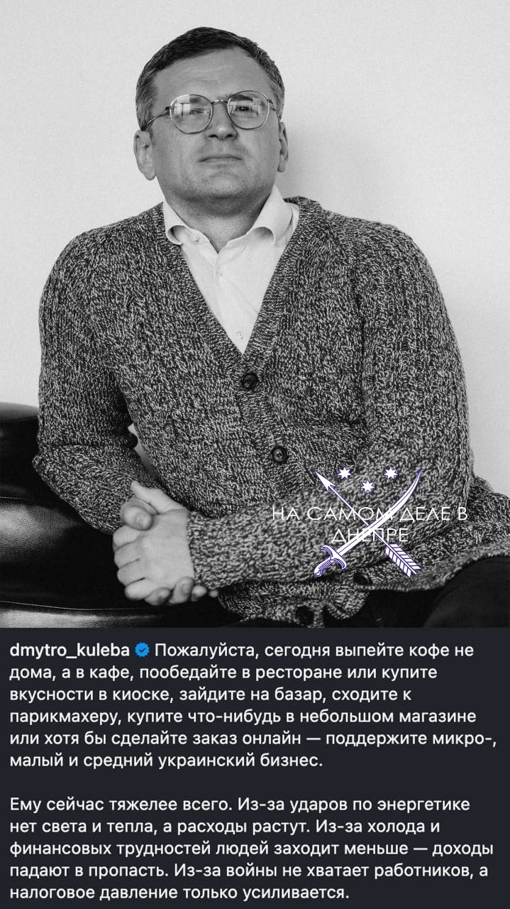 Кулеба призывает украинцев пить кофе не дома, а в кофейнях, чтобы поддержать бизнес, а то загнётся, бедненький. А кто поддержит простых украинцев, у которых в квартире зона вечной мерзлоты, да и к тому же, без света? И у этой мрази ещё хватает наглости зазывать людей в рестораны на фоне всего этого кошмара. Не пост, а издевательское глумление над собственным народом.