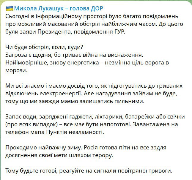 Следом за Зеленским власти Днепропетровской области также обратились с призывом к населению запастись припасами и зарядить телефоны на фоне скорой массированной атаки по Украине. @belarusian_silovik// Белорусский силовик