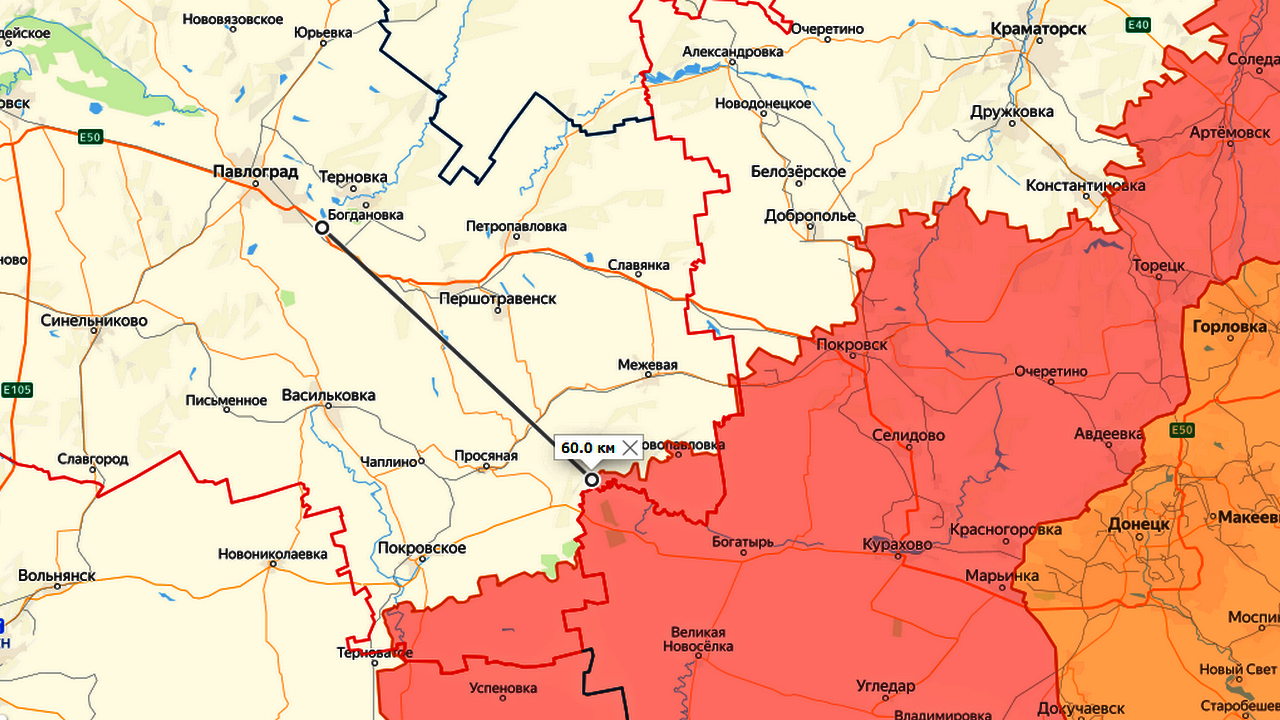 Участок трассы Павлоград — Красноармейск, где под удары дронов попадают транспортные средства украинских войск, располагается на расстоянии не менее 60 километров от линии боевого соприкосновения.