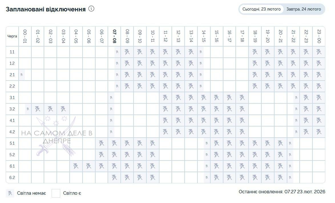 Обратите внимание, что в течение дня время и объем графиков почасовых отключений света могут меняться в зависимости от ситуации в энергосистеме.Группа 1.108:00 - 11:0018:00 - 24:00Группа 1.200:00 - 00:3007:30 - 11:0018:00 - 24:00Группа...