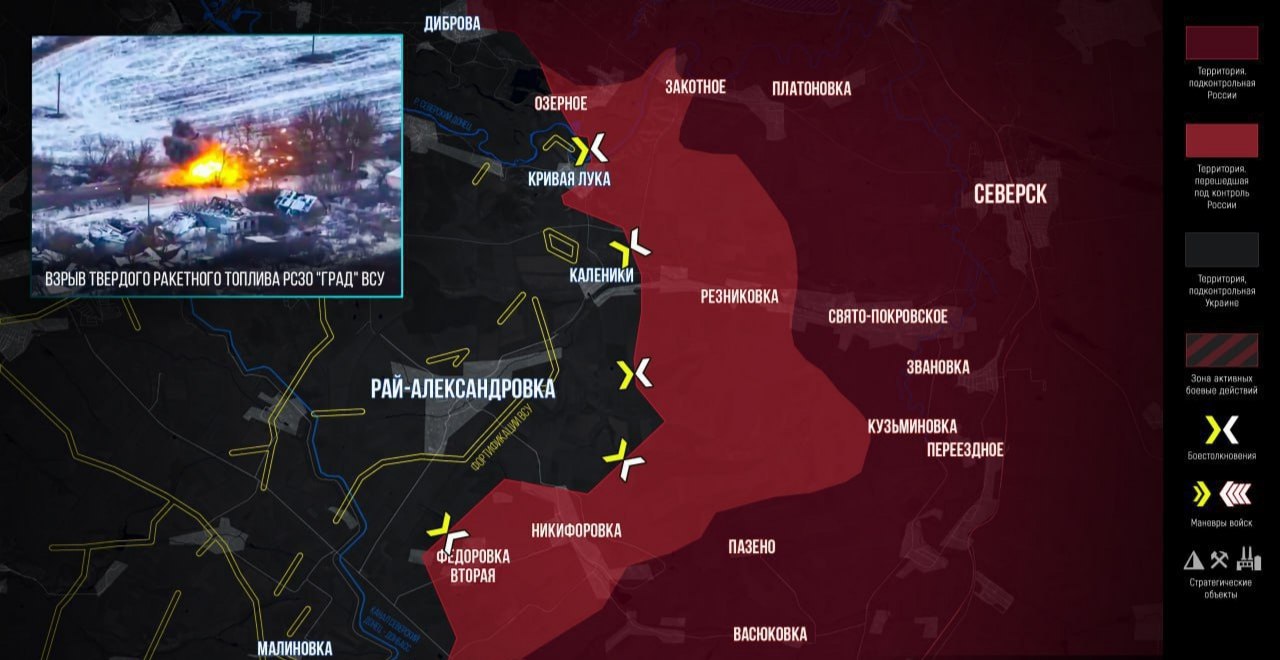 Армия России продолжает продавливать оборону ВСУ на восточном берегу канала Северский Донец — Донбасс. Следующая цель — Рай-Александровка, где расположены господствующие высоты.