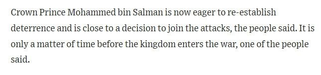 Источники WSJ сообщают, что наследный принц Саудовской Аравии Мухаммед бин Салман стремится восстановить сдерживающий фактор и близок к решению присоединиться к атакам.