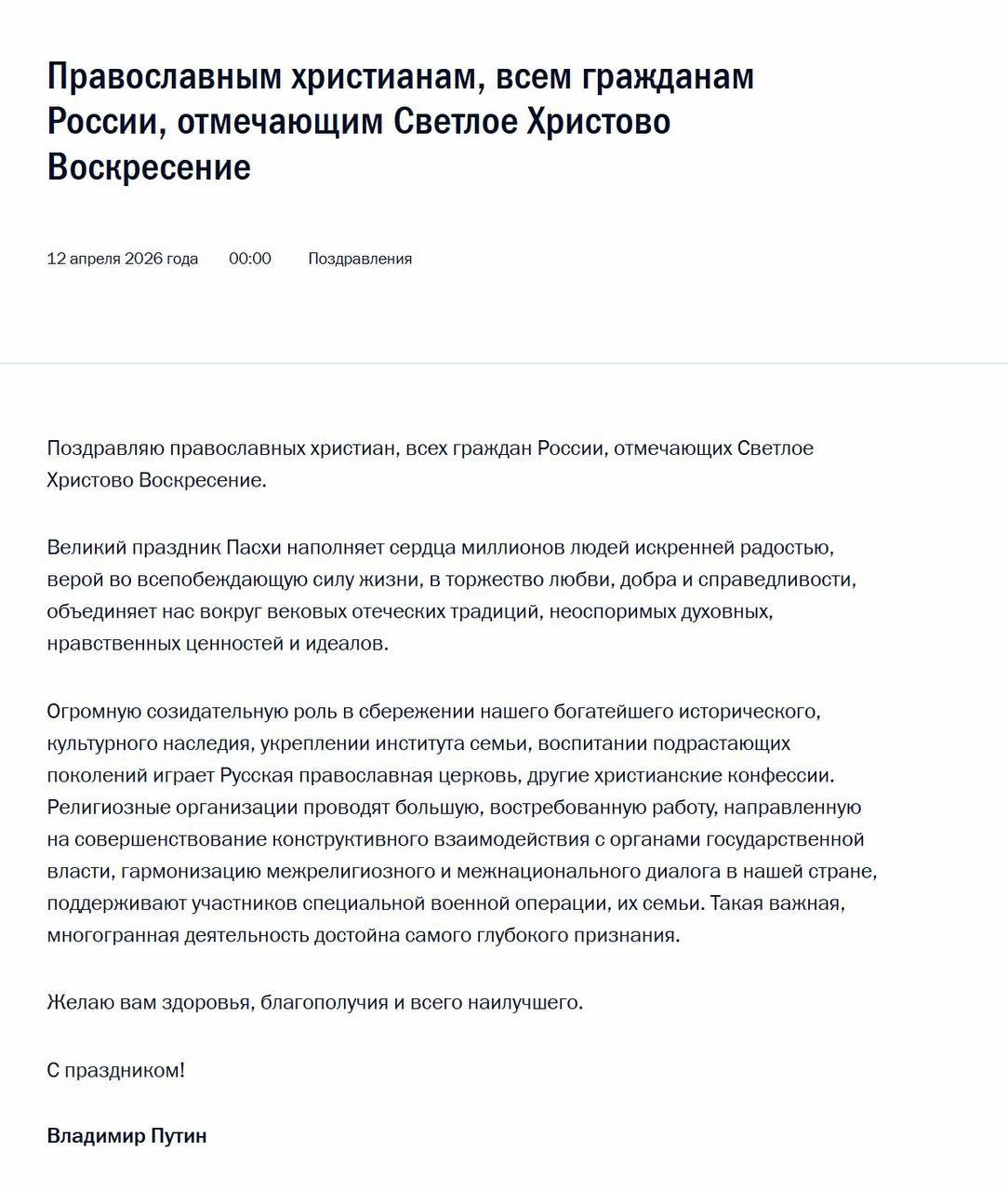 Владимир Путин поздравил православных христиан и всех граждан России, отмечающих Пасху