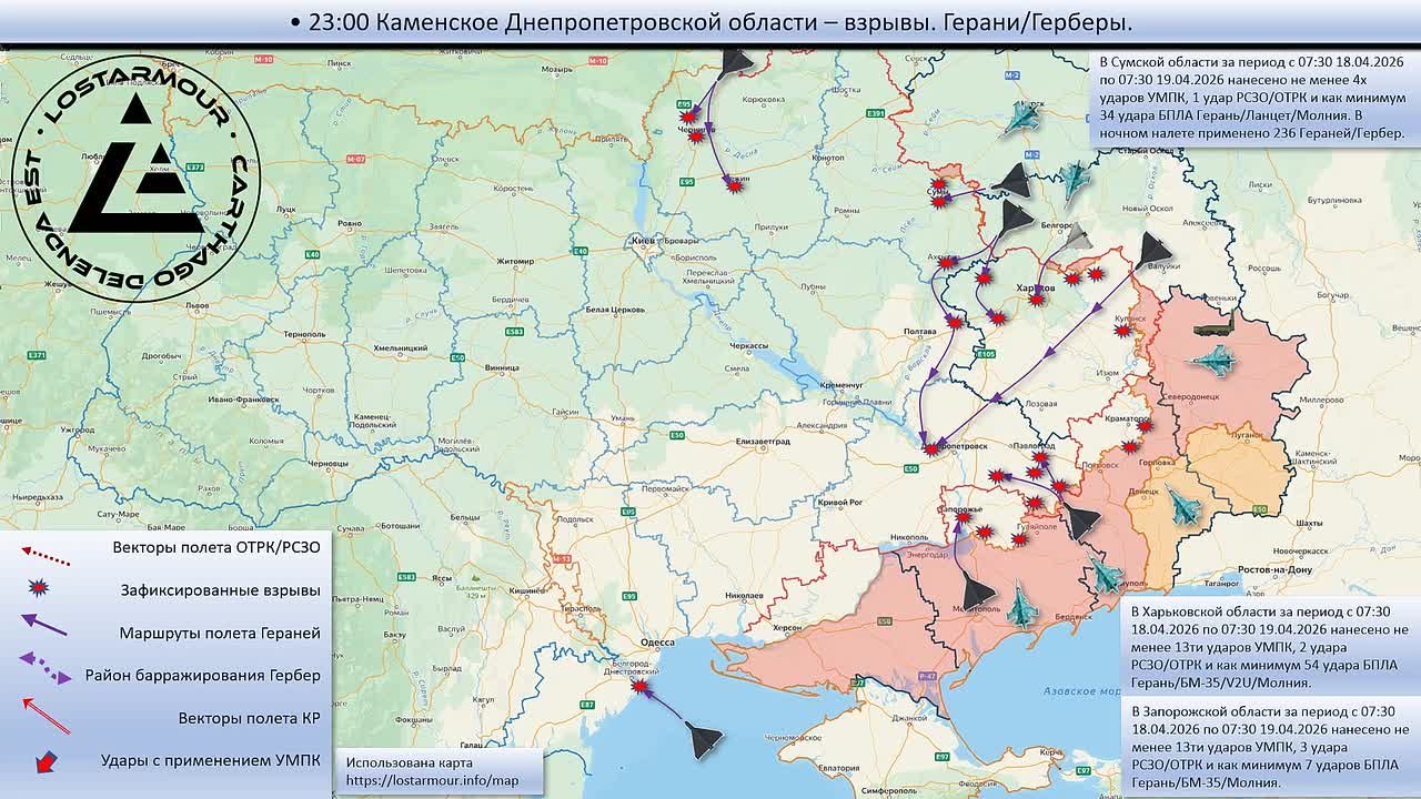 Анимированная схема ударов по территории Украины 18 апреля 2026 - 19 апреля 2026 года